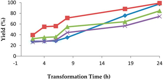 Substrate 1b was added at different phases of growth. Addition of substrates at the beginning of the fermentation caused growth inhibition; therefore, substrate feeding (10 mM) was performed after induction. As illustrated in Figure 1, the 24-h-grown growing cells of R. rubra AS 2.2241 reduced ketone 1b into alcohol (S)-2b within 24 h of incubation, while 48-h-grown growing cells also took 24 h to complete the transformation. In the case of 72-h-grown growing cells, the transformation was slightly smaller, and 84% of the added ketone 1b was transformed after 24 h of incubation. Only 74% of ketone 1b was transformed by 96-h-grown growing cells after 24 h of incubation. No further transformation was noticed with 96-h-grown cells with a prolonged period of incubation. In all cases, the initial ketones 1b concentration was 10 mM. Thus, it is clear from these experiments that 24- and 48-h-grown growing cells were most active in transforming ketone 1b to alcohol (S)-2b. This may be due to the presence of active enzymes after 24 and 48 h of growth. It has also been reported that maximum carbonyl reductase activity was obtained within 45–50 h of cultivation of Acetobacter pasteurianus GIM1.158 [37]. Poor enzyme activity was observed in 72-h-grown and 96-h-grown cultures, making the transformation of ketone 1b inefficient. Poor enzyme activity may be due to the production of some metabolites that inactivated the enzyme. Transformation of ketone 1b with growing cells used much more enzyme than that with the soluble enzyme system, but the time required for the transformation with the growing cells was not shorter. This is possible because the enzymatic system with the growing cells worked in an uncleaned environment (with cells, unused substrates and metabolites, etc.).