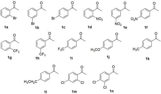 We next turned our attention to the substrates scope and the limitation of growing cells of strain R. rubra AS 2.2241 for the reduction of prochiral ketones 1a1n. Another 13 aromatic ketones that were structurally closely related to the main test substrate 1b were tested (Figure 2) under the optimized conditions (addition of 10 mM substrates at the beginning of the fermentation and incubation for 72 h at 28 °C in RM1 medium buffer at pH 7.0), with the results presented in Table 3. Since the corresponding racemic reduction products (±)-β-phenylalcohols 2a2m (except 2b) were not commercially available, they were obtained by the reduction of the aromatic ketones 1a, 1c1m with sodium borohydride in methanol [38] and used as standard compounds for the analysis of the bioreduction products via chiral HPLC. The NMR spectra are in agreement with those reported in the literature [35,39,40,41,42,43].