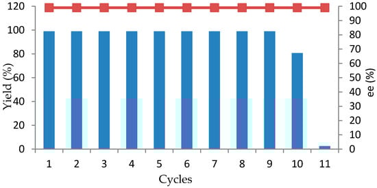 One of the important considerations for industrial production is the capacity to recycle the catalyst. Therefore, experiments were performed to examine the recyclability of the resting cells of R. rubra AS 2.2241 for the reduction of 1b as an example. For the results summarized in Figure 3, every reaction was performed in 10 mL of Na2HPO4-KH2PO4 buffer (100 mM, pH 7.0) with 3 g of wet cells, 10 mM substrate and 0.5 g of glucose and shaken at 25 °C for 23 h. At the end of the reaction, the cells were centrifuged, washed twice with the same buffer [Na2HPO4-KH2PO4 buffer (100 mM, pH 7.0)] and reused for the next cycle under the same reaction conditions. Resting cells of strain R. rubra AS 2.2241 exhibited high activity and complete conversion for nine cycles (Figure 3). Only a slight decrease was observed in cycle 10, whereas almost no activity (2.6% yield of the desired product) was found in cycle 11. Remarkably, the reduction product ee showed no significant variation and remained above 99%. The high reusability of the whole cells of the strain R. rubra AS 2.2241 could be attributed to the expression of naturally immobilized ketone reductase in the cells, which is currently being implemented in our laboratory.