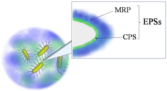 Schematic picture illustrating the typology of exopolysaccharides (EPSs): medium released exopolysaccharides (MRPs) and capsular polysaccharides (CPSs).