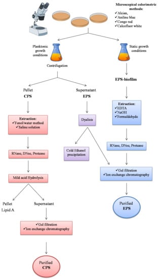 General scheme illustrating detection, extraction and purification of exopolysaccharides from microorganism’s planktonic and sessile growth.
