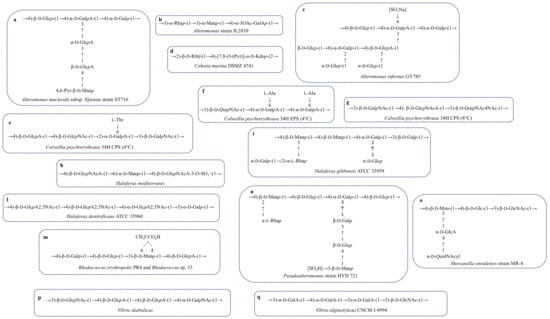 Repeating units of EPS and CPS structures from marine bacteria and archaebacteria. (a) Alteromonas macleodii subsp. fijiensis strain ST716; (b) Alteromonas strain Jl2810; (c) Alteromonas infernus GY 785; (d) Cobetia marina DSMZ 4741; (e) Colwellia psychrerythraea 34H CPS (4 °C); (f) Colwellia psychrerythraea 34H EPS (4 °C); (g) Colwellia psychrerythraea 34H CPS (8 °C); (h) Haloferax mediterranei; (i) Haloferax gibbonsi ATCC 33959; (l) Haloferax denitrificans ATCC 35960; (m) Rhodococcus erythropolis PR4 and Rhodococcus sp. 33; (n) Pseudoalteromonas strain HYD 721; (o) Shewanella oneidensis MR-4; (p) Vibrio diabolicus (m); (q) Vibrio alginolyticus CNCM I-4994.