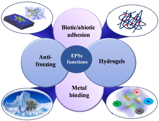 Another prosthecatum bacterium, Hyphomonas VP-6, produces two different EPSs, a capsule and holdfast EPS, involved in the first step of biofilm formation (Table 2) [].
