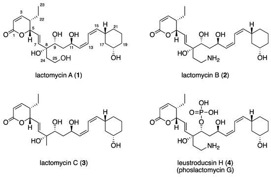 Sun, Y.; Carandang, R.R.; Harada, Y.; Okada, S.; Yoshitake, K.; Asakawa, S.; Nogi, Y.; Matsunaga, S.; Takada, K. Lactomycins A–C, Dephosphorylated Phoslactomycin Derivatives that Inhibit Cathepsin B, from the Marine-derived Streptomyces sp. ACT232. Mar. Drugs 2018, 16, 70. https://doi.org/10.3390/md16020070