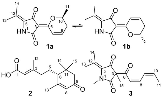 3-((2Z,4Z)-Hexa-2,4-dienoyl)-1,3-dimethyl-5-(propan-2-ylidene)pyrrolidine-2,4-dione (3): a yellow powder; −5.6 (c 0.1, MeOH); 1H and 13C NMR data, see Table 1; ESIMS m/z 284 [M + Na]+.