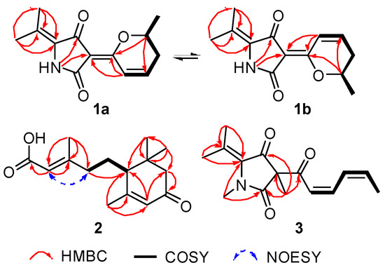 Key 2D NMR correlations for the structural assignment of 1–3.