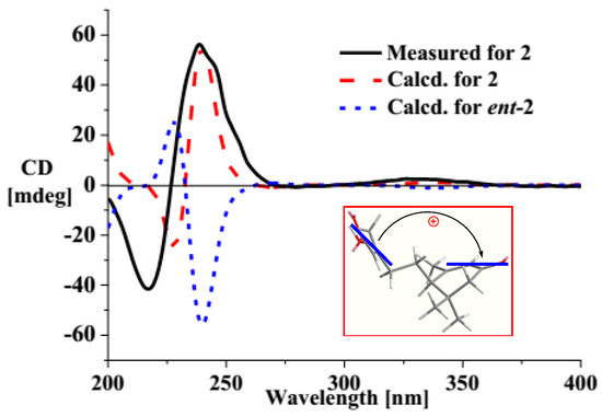 Cladosacid (2) was obtained as an amorphous powder and its molecular formula was determined to be C15H20O3 on the basis of a HRESIMS peak at m/z 249.1496 [M − H]− (Figure S17) and m/z 251.1645 [M + H]+ (Figure S18). By means of DEPTQ and HSQC experiments (Figures S11 and S12), the 1D NMR spectra (Figures S10 and S11) displayed four methyls, three sp3 methylenes, two sp2 methines, one sp3 methine, and five non-protonated carbons including one sp3 carbon, two sp2 carbons, one carboxylic carbon and one conjugated ketone carbon (Table 1). The existence of a carboxylic group was suggested from the negative ion ESIMS at m/z 249 (Figure S16) as well as the very close δC-1 value (170.4 ppm) to δCOOH of callilongisin D (170.5 ppm) [21]. The key HMBC correlations of H3-14/H3-15 to C-6/C-10/C-11, H3-14 to C-15, H2-10 to C-6/C-8/C-9, H-8 to C-6/C-10, and H3-13 to C-6/C-7/C-8 (Figure 2 and Figure S14) revealed the presence of a 3,5,5-trimethyl-2-cyclohexenone nucleus. HMBC correlations of H-2 to C-1/C-3, and H3-12 to C-2/C-3/C-4 (Figure 2), along with the 1H-1H COSY correlation of H2-4 and H2-5 (Figure S13), suggested the presence of 4-carboxy-3-methylbut-3-en-1-yl group. Furthermore, the 1H-1H COSY correlation between H2-5 and H-6 located the substituent group at C-6 of the cyclohexenone nucleus. The NOESY correlation between H-2 and H-4 suggested E-geometry of Δ2-double bond (Figure S15). Both compound 2 and the known compound 9,10-dihydroxy-4-megastigmen-3-one [22] had the same cyclohexenone nucleus with a chiral C-6 carbon. The only difference between them was that the 4-carboxy-3-methylbut-3-en-1-yl group in 2 replaced the corresponding 3,4-dihydroxybutyl in 9,10-dihydroxy-4-megastigmen-3-one. Compound 2 and the 9,10-dihydroxy-4-megastigmen-3-one had similar UV (245 vs. 240 nm) but distinct ECD [239 (+0.44) and 218 (−0.32) vs. 350 (+0.21) and 274 (+0.81) nm] data, indicating that the α,β-unsaturated carboxylic acid and α,β-unsaturated ketone chromophores in 2 must interact with each other to generate exciton ECDs [23]. This phenomenon had also been found in the similar compound, (+)-trans-abscisic acid [24]. The ECD spectrum of compound 2 showed a positive Cotton effect, indicating the 6R- absolute configuration (Figure 4). Furthermore, ECD calculations of 2 and ent-2 using the TDDFT method at the B3LYP/6-31G(d) level was performed [13]. The results showed that the measured ECD curve matched well with the calculated ECD of 2 and opposite to that of ent-2 (Figure 4), further confirming 6R- configuration.