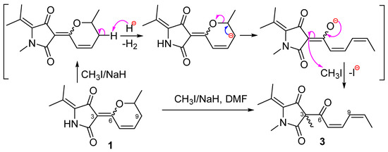 In order to confirm the constitution of 1, a methylation was done by adding NaH and CH3I reagents to the N,N-dimethylformamide (DMF) solution of 1 (Scheme 1). The reaction product was purified and identified to be 3-((2Z,4Z)-hexa-2,4-dienoyl)-1,3-dimethyl-5-(propan-2-ylidene)pyrrolidine-2,4-dione (3) by MS (Figure S25), 1D and 2D NMR data (Figure 2 and Figures S19–S24). Compound 1 could undergo an N-methylation followed by an intramolecular elimination [19] and methylation under basic conditions to generate 3. The postulated mechanism was showed in Scheme 1. Cladodionen (1) could undergo a nucleophilic reaction at N-1 with CH3I/NaH in DMSO solution to form N-methylcladodionen first followed by the deprotonation at C-9 of N-methylcladodionen to generate a carbanion intermediate. Then a cleavage of C–O sigma bond of the hydropyran ring took place to form the key intermediate, an enolate ion with an open chain, which underwent a nucleophilic substitution with CH3I to generate 3.
