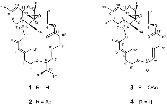 Structures of roridin E (1), roridin E acetate (2), verrucarin L acetate (3), verrucarin J (4).