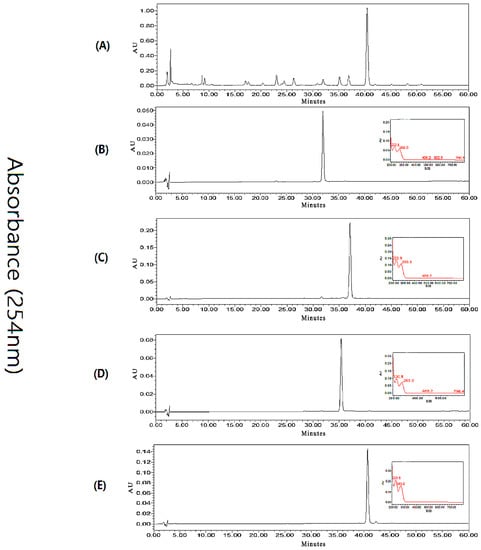 Representative analytical HPLC chromatograms. (A) Crude extract of Fusarium sp; (B) refined peak 1 from HSCCC, corresponding to compound 1; (C) refined peak 2 from HSCCC, corresponding to compound 3; (D) refined peak 3 from HSCCC, corresponding to compound 2; (E) refined peak 4 from HSCCC, corresponding to compound 4. For B–D, UV profiles of the major peak are inset at 254 nm.