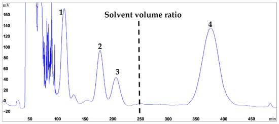 The use of the “HeMWat”, or hexanes–EtOAc–CH3OH–H2O, solvent system at volumetric ratios of 1:1:1:1 and 5.5:4.5:5:5 both afforded larger KD values unsuitable for the separation of the trichothecene mycotoxins investigated. However, the biphasic solvent system of hexanes–EtOAc–CH3OH–H2O at a volumetric ratio of 6.5:3.5:5:5 yielded acceptable KD values of compounds 1–3 between 0.5 and 2, although compounds 2 and 3 had an unsuitable separation factor α < 1.5. However, the biphasic hexanes–EtOAc–CH3OH–H2O solvent system at a volume ratio of 6:4:5:5 led to the observation of the KD values between 0.5 and 2 for compounds 1, 2, and 3, and each pair had a separation factor α > 1.5. Nevertheless, this solvent system offered an unsuitable KD value (2.58) for compound 4. To overcome this problem, the hexanes–EtOAc–CH3OH–H2O 8.5:1.5:5:5 solvent system was selected for the second part of the HSCCC run, since it produced a suitable KD value of 1.12 for compound 4, and it would only be used in stepwise mode after the elution of 1–3.