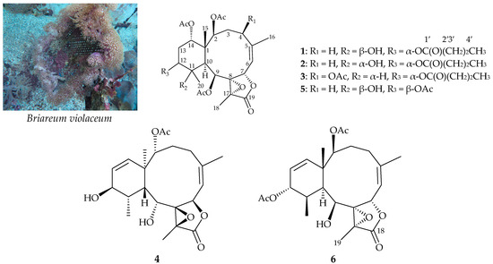 Cultured octocoral B. violaceum and structures of briaviolides K–N (1–4), excavatoid F (5), and (1S*,2S*,5Z,7S*,8S*,9S*,10S*,11R*,12R*,13Z,17R*)-2,12-diacetoxy-8,17-epoxy-9-hydroxybriara-5, 13-dien-18-one (6). The 1′2′3′4′ means the serial numbers of the carbon atom of the n-butyrate moiety.