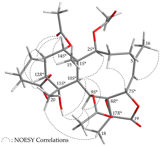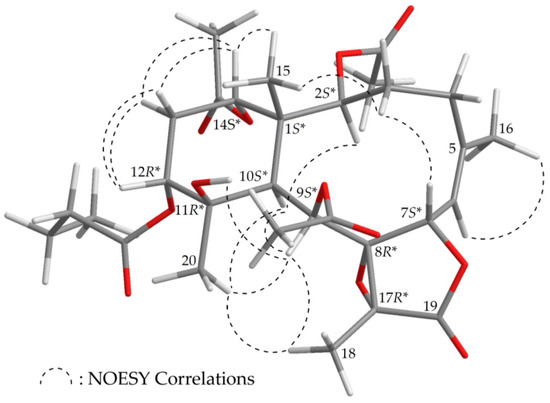 The stereochemistry of 3 was established based on the NOE interaction results from the NOESY experiment (Figure 4). In the NOESY spectrum of 3, H-10 was associated with H-2, H-9, and H-11, while no associations were seen with Me-15 and Me-20, which suggested that these protons were positioned on the α face, due to the fact that the C-15 and C-20 methyls were β-substituents at C-1 and C-11, respectively. H-12 showed a correlation with Me-20, and H-14 was correlated with Me-15; there was no correlation between H-10/H-12 and H-10/H-14, demonstrating that the n-butyroxy and acetoxy groups at C-12 and C-14 were α-oriented. As one of the methylene protons at C-3 (δH 2.89) was correlated with H3-15, the proton was assigned as H-3β. Additionally, H-7 was assigned as β-oriented due to the existence of an association with H-3β. The Z- configuration of the C-5/6 double bond was established based on the interaction between H-6 and H3-16. Furthermore, correlation of H-4 with H3-16 indicated that the acetoxy group at C-4 was β-oriented, and H3-18 and H-9 correlation suggested that Me-18 should be positioned on the β-face in the γ-lactone ring (Supplementary Materials, Figures S19–S27). Thus, on the basis of the above results, 3 was found to possess the configuration 1S*,2S*,4R*,7S*,8R*,9S*,10S*,11R*,12R*,14S*, and 17R*.