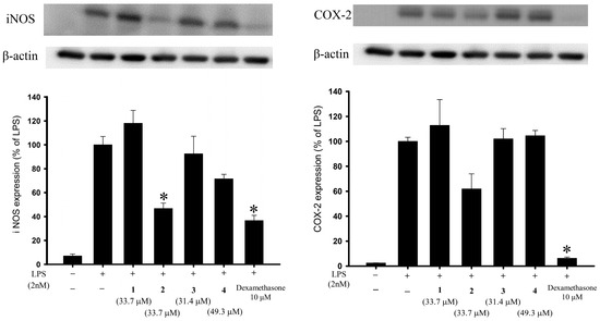 Murine macrophage-like RAW264.7 cell line was purchased from the American Type Culture Collection (ATCC, No TIB-71) (Manassas, VA, USA). The in vitro model of the assay, which was used to evaluate the anti-inflammatory activities of compounds 1–4, was performed using RAW264.7 cells pre-treated with compounds 1–4 then incubated with LPS to induce pro- inflammatory protein expressions. The inhibition effects of the compounds on the expressions of LPS-induced pro-inflammatory iNOS and COX-2 proteins in the cells were assessed using western blot analysis [26,27,28]. Briefly, RAW264.7 cells were untreated or pre-treated with 20 μg/mL compounds 1–4 (33.7, 33.7, 31.4, and 49.3 μM, respectively) or 10 μM dexamethasone as a positive control for 10 min, followed by adding 10 ng/mL LPS (2 nM), and incubating for 16 hr. The cell lysates were then collected for western blotting analysis. Protein expression levels were calculated based on the intensities of the bands on the blots representing the immunoreactivity to the iNOS and COX-2 antibodies. The cytotoxic effects of compounds 1–4 were also evaluated using a trypan blue exclusion assay [27,28]. Statistical analyses were performed using one-way analysis of variance (ANOVA), and data were further processed by the Student–Newman–Keuls post hoc test for multiple comparisons. A p-value of <0.05 was considered to indicate a significant difference between two treatments.