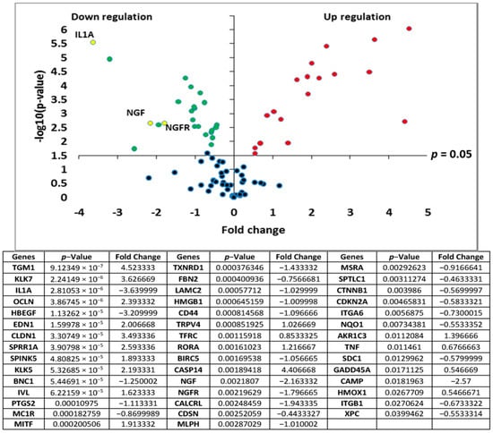 Rhodosorus marinus extract after 24 h of treatment. Among them, IL1A, NGF, and NGFR were down-regulated by a factor of −3.6 (