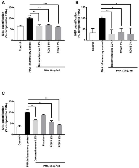 Cytotoxicity tests were performed to confirm that the Rhodosorus marinus extract was not toxic on NHEK and NHA (data not shown). Pooled normal human epidermal keratinocytes (adult, from Lonza) were seeded in 12-well plates at 100,000 cells per well. After 48 h, cells were washed in PBS (GibcoTM, Thermo Fischer Scientific, Illkirch, France) and the culture medium was replaced by KGM (Keratinocytes Growth Medium, Lonza, Basel, Switzerland) without hydrocortisone, an anti-inflammatory molecule that can influence the PMA effect and consequently the secretion of NGF and IL-1a. After 24 h, cells were prestimulated with dexamethasone (10 µM) or Rhodosorus marinus extract at 1% and 3% for 2 h at 37 °C. Cells were then stimulated with PMA (phorbol myristate acetate, Sigma) at 10 ng/mL. After 48 h of stimulation at 37 °C, supernatant was collected, the released NGF was quantified by ELISA (Abcam, Cambridge, UK), and the secretion of IL-1a was quantified by ELISA from R&D system (DLA50). For each ELISA, the experimental procedure recommended by suppliers was used and the measurements were performed using a TECAN microplate reader.