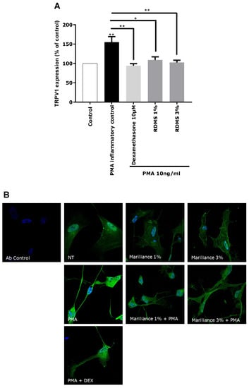Normal human astrocytes (NHA, Lonza) were seeded at 60,000 cells per well in 24-well plates containing glass slides precoated with poly-l-lysine (Gibco) for 30 min at 37 °C. After 48 h, cells were pretreated for 2 h at 37 °C with dexamethasone (Sigma) at 10 µM, an anti-inflammatory molecule, or with the Rhodosorus marinus extract at 1% and 3% in the presence of 2 µM Ica (calcium ionophore). Cells were then stimulated with PMA (phorbol myristate acetate, 10 ng/mL) at 37°C to induce in vitro inflammation. After 24 h, cells were permeabilized for 5 min at RT with buffer containing 2% paraformaldehyde (PFA) and 0.5% Triton X100 (Sigma) in PBS. After three washes in filtered PBS, cells were fixed in 2% PFA in PBS for 10 min at RT. After three washes in PBS, specific sites were saturated with a 3% BSA (Sigma) solution containing 0.1% Tween20 (Sigma) in PBS for 1 h at RT. TRPV1 receptor was stained with a specific anti-TRPV1 primary antibody (Abcam ab74855) diluted at 1/500 in saturation buffer diluted at 1/10 (0.3% BSA solution containing 0.01% Tween 20) and incubated overnight at 4 °C in a humid chamber. After three washes in PBS containing 0.3% Triton X100, cells were incubated with secondary antibody coupled to Alexafluor488 diluted at 1/500 supplemented with Hoechst (10 µg/mL) and incubated 2 h at RT protected from light. The cells were washed as previously and mounted on slides with a specific mounting medium; staining was analyzed by classical fluorescence microscopy (Zeiss, Kwai Chung, Hong Kong) and quantified by Image J.