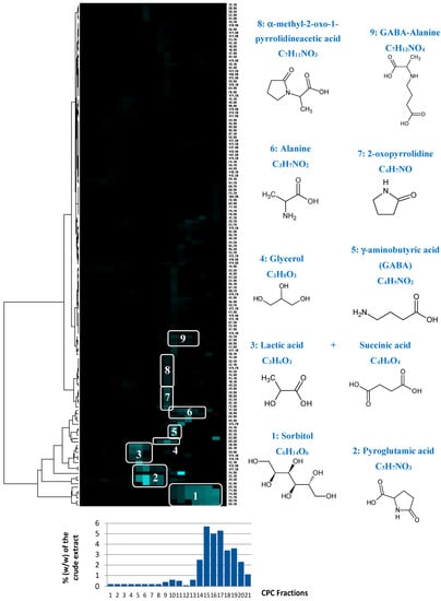13C NMR data of natural compounds, the structure of sorbitol was proposed as the first hit of over 43 proposals. This structure was successfully confirmed by checking all chemical shifts of sorbitol in raw NMR data of fractions F17, F18, and F19 where the intensity of Cluster 1 was predominant, and by 2D NMR analyses of F18. By applying exactly the same approach, Clusters 2, 4, 5, and 6 were identified as pyroglutamic acid, glycerol, γ-aminobutyric acid, and alanine, respectively. Cluster 3 corresponded to a mixture of lactic acid and succinic acid. Clusters 7, 8, and 9 did not match exactly with database proposals, but they were unambiguously identified as 2-oxopyrrolidine, α-methyl-2-oxo-1-pyrrolidineacetic acid, and GABA-alanine by manually performing the structural elucidation process with the 2D NMR spectra of F13 and F14.