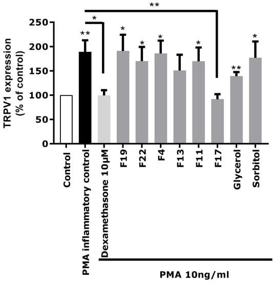 Figure 5, the significant over-expression of TRPV1 induced by PMA in astrocytes was reduced by the anti-inflammatory reference dexamethasone. Fractions F4, F11, F13, F19, and F22 showed a similar effect as PMA alone and did not reduce TRPV1 over-expression, indicating that these fractions were not active and unable to modulate the PMA-induced inflammation. Similarly, sorbitol and glycerol tested as pure compounds were not able to reduce the over-expression of TRPV1 induced by PMA. In contrast, fraction F17 induced a significant decrease of TRPV1 expression similar to that observed with the crude
