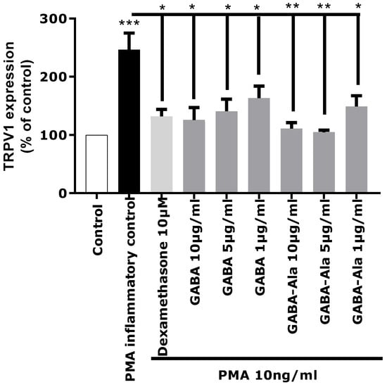 The in vitro activity of pure GABA and pure GABA-Ala on neuro-inflammation related to TRPV1 over-expression was therefore evaluated to determine if these two molecules were truly active. GABA and GABA-Ala were tested at the dose defined in the