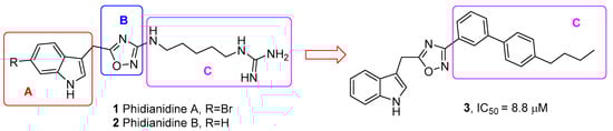 Protein tyrosine phosphatase 1B (PTP1B) is well-recognized as a potential target for the treatment of type II diabetes and obesity [1,2,3,4,5]. Many efforts have been made for the development of PTP1B inhibitors, while their low selectivity over the other protein tyrosine phosphatases (PTPs) and poor cell permeability are still two main issues, which prevent these compounds from being developed as marketed drugs [6,7]. Therefore, searching for new specifically selective PTP1B inhibitors is of high importance. In recent years, natural marine products have been regarded as new sources of potential PTP1B inhibitors, since various marine-derived PTP1B inhibitory phenols, terpenes, alkaloids, and terpene-alkaloid hybrids were isolated from algae, sponges, marine fungi, etc., with IC50 values ranging from 0.8 to 15 μM [8]. Our group has long been engaged in the discovery of bioactive natural marine products, with various novel molecules being isolated and structurally identified [9,10,11]. For example, phidianidines A and B (Figure 1) are two unprecedented indole alkaloids, bearing an uncommon 1,2,4-oxadiazole ring and a terminal guanidine group, isolated from the marine opisthobranch mollusk Phidiana militaris in 2011 [12]. These metabolites and their derivatives were found to exhibit significant cytotoxic, DAT inhibitory, or neuroprotective activities [13,14,15].
