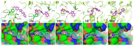Docking results for compounds 14c, 14p, and 14l–14n on PTP1B, respectively (upper row: without showing surface of PTP1B, lower row: showing surface of PTP1B).