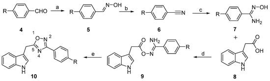 The initial plan was to simplify the C moiety of compound 3 by removing one aryl ring, as shown in Scheme 1. The synthesis was similar as our previous reported route. The treatment of aryl aldehyde 4 (4a−4d) hydroxylamine hydrochloride (NH2OH·HCl), in the presence of sodium hydroxide (NaOH) in 50% EtOH (in water), yielded oxime 5. Dehydration of 5 with a dichloro(p-cymene)ruthenium(II) dimer in acetonitrile (CH3CN) led to the nitrile 6 [17], which further reacted with NH2OH·HCl and sodium bicarbonate (NaHCO3) in EtOH, affording amidoxime 7. Esterification of 7 with 3-indoleacetic acid in the presence of 2-(7-Azabenzotriazol-1-yl)-N,N,N′,N′-tetramethyluronium hexafluorophosphate (HATU) and N,N-diisopropylethylamine (DIPEA) in CH2Cl2 provided compound 9. Intramolecular cyclization of 9 in the presence of sodium acetate (NaOAc) in 30% EtOH under reflux gave rise to the oxadiazole product 10 [18]. In order to make sure that the guanidine group was not correlated for the PTP1B inhibitory activity, the natural product phidianidine B (2) was also synthesized by following Chamberland’s route [19].