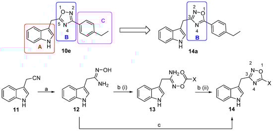 Reagent and conditions: (a) NH2OH·HCl, NaHCO3, EtOH, 65 °C, 4 h; (b) for 14a–14k, and 14p–14u: i, carboxylic acid, HATU, DIPEA, CH2Cl2, r.t., 2 h; ii, NaOAc, 30% EtOH, reflux, overnight. (c) For 14l–14o, acyl chloride, K2CO3, toluene, reflux, 4 h.