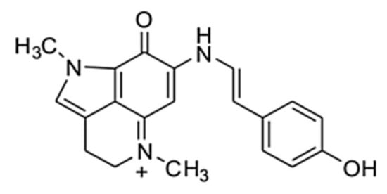 - Carney, J.R.; Scheuer, P.J.; Kelly-Borges, M. Makaluvamine G, a cytotoxic pigment from an an Indonesian Sponge Histodermella sp. Tetrahedron 1993, 49, 8483–8486. [Google Scholar] [CrossRef]
