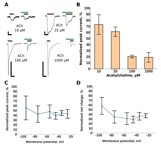 To assess the possibility of an open-channel block, we performed electrophysiological experiments using membrane potentials in the range from –30 to –100 mV. To avoid the possible influence of acute receptor desensitization, we calculated both the amplitude reduction of acetylcholine (ACh)-evoked current (Figure 2C) and the ACh-evoked net-charge flow through the channel (Figure 2D). In this case, we took into account the possible reduction of the peak width with no amplitude change. No increase in the inhibition of the receptor activity at higher negative membrane potentials (which would be interpreted as a sign of a channel block) was detected. This could mean that a direct channel block is not consistent with our data and that other explanations of un-competitive receptor inhibition should be found.