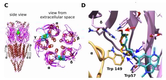 MG inhibits 125I-α-bungarotoxin binding to the muscle-type nAChR of Torpedo californica, thus, indicating that it binds at the orthosteric site. We performed molecular docking to the model of muscle nAChR to explore the possible modes of MG binding. To validate our docking procedure, the docking of the acetylcholine molecule to the molecular model of an α+δ− inter-subunit site of the muscle-type nAChR was conducted. The α+δ− site was chosen because it is present in both the fetal and adult forms of the muscle nAChR. The acetylcholine docking resulted in structures that are in a good agreement with the published experimental data showing a similar acetylcholine position in the binding site of AChBP (PDB 3WIP) []. Docking of the MG molecule to the α+δ− inter-subunit site of muscle-type nAChR revealed a possible binding position that shares some features with acetylcholine docked at the same site. For example, the very similar positions of oxygen and nitrogen atoms (Figure 3D, pointed by arrows) in the vicinity of the Trp149 residue that is known to be crucial for the action of nAChR agonists []. Moreover, the docking identified that the pyrroloiminoquinone moiety of MG forms hydrophobic contacts with several other residues of the receptor, among them is the Tyr190 in α1 subunit and Asp59 residue in the complementary (in this case δ) subunit. Mutations of these residues have earlier been shown to influence gating mechanisms of the receptor by altering its activity [,]. Thus, according to docking results, MG molecule might form contacts with the receptor residues that are involved in receptor gating and desensitization while binding at the orthosteric site.