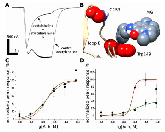 Receptor mutagenesis and fluorescence assay. (A) Comparison of acetylcholine-evoked current time course in control conditions and under co-application of MG; (B) the putative structure of the MG complex with muscle nAChR. Note that the G153 residue (involved in the receptor gating according to the literature data) is situated in loop B near the orthosteric site. Loop C residues are not shown; (C) the dose-response of the wild-type (WT) muscle nAChR to acetylcholine is not significantly altered by 2.5 μM MG according to the induced changes in the cytoplasmic Ca2+ level. The curve equation is % response = 100/{1 + ([compound]/EC50)n}, where EC50 is the half-maximal response and n is the Hill coefficient. The control curve is shown in red, the curve showing data of the MG is shown in green; (D) the gain-of-function point mutation G153S in the α1 subunit which increases the receptor sensitivity to ACh and decreases the acute desensitization rate also increases the receptor sensitivity to MG. The dose-response of the mutant G153S muscle nAChR to the acetylcholine insignificantly altered by 2.5 μM MG according to the induced changes in the cytoplasmic Ca2+ level. The control curve is shown in red, the curve showing the data with the MG is shown in green. These data suggest that there is a close interconnection between the muscle nAChR desensitization and inhibition of this receptor by MG. We found that 2.5 μM MG does not affect the WT receptor dose response to acetylcholine measured by this method, but it is sufficient to significantly (p < 0.01, t-test for normalized maximal responses) suppress the acetylcholine-evoked Ca2+ concentration rise mediated by the G153S mutant (Figure 4C,D, respectively).