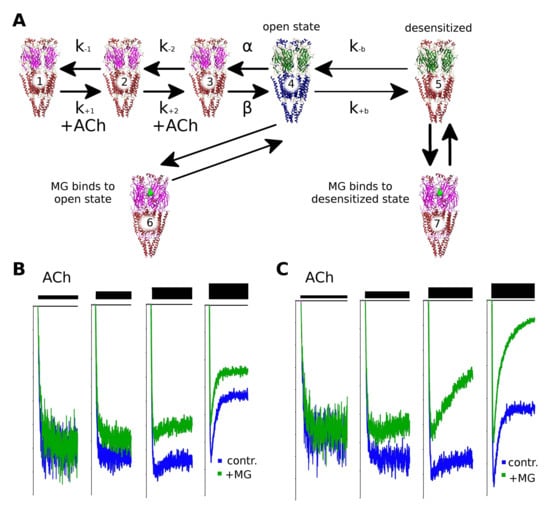 (A) The kinetic scheme of muscle nAChR activation and desensitization (states from 1 to 5) and the proposed states of the receptor that correspond to the un-competitive mode of inhibition (state 6) and the apparent increase of desensitization (state 7). The states with transmembrane segments depicted in red are non-conducting, the only conducting state is shown in green and blue, and the desensitized state is shown in green and red; (B) the currents simulated according to the kinetic scheme, MG binding only to the open state is considered. Note the increase of inhibition (but not the desensitization rate) with the increase of the ACh concentration (control simulated currents are shown in blue, simulated currents in the presence of MG are shown in green).The currents were scaled to match the maximal response amplitude; (C) the currents simulated according to the kinetic scheme, MG binding to both open and desensitized states is considered. Note that the apparent desensitization rate increased (simulated current in the presence of MG decays faster). The control simulated currents are shown in blue, the simulated currents in the presence of MG are shown green, the currents were scaled to match the maximal response amplitude. Thicker bars designate higher acetylcholine concentrations.