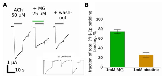 The Makaluvamine G interaction with theα4β2 nAChR. (A) The inhibition of the ACh-evoked currents in the Xenopus oocytes expressing rat α4β2 nAChR. Acetylcholine (50 μM) and MG (25 μM) applications are shown by the black and green bars, respectively. The inset picture shows the effect of 10 μM d-tubocurarine on this receptor; (B) The inhibition of equilibrium [3H]-epibatidine binding to the transfected SH-EP cells expressing α4β2 nAChR by 1 mM of MG compared to 1 mM of nicotine. The data are presented as the mean ± standard error.