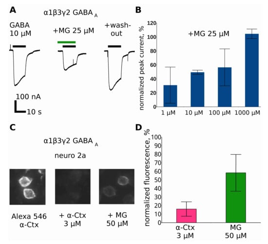 In good agreement with the surmountable inhibition, MG shows the ability to displace fluorescent α-cobratoxin derivative binding to cells overexpressing GABAAR (Figure 6C,D).