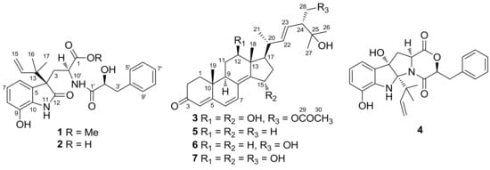 Marine-derived filamentous fungi, especially those of the species in the genera Aspergillus and Penicillium, are rich sources of natural products possessing diverse scaffolds and bioactivities [1]. Among them, fungi associated with marine algae are a promising source of research on the secondary metabolites. During our ongoing investigations of marine algal-derived fungi for structurally unique and biologically active metabolites [2,3,4], the fungal strain Aspergillus alabamensis EN-547 was isolated from the fresh inner tissue of the marine red alga Ceramium japonicum. When the EtOAc extracts of its culture broth was analyzed by HPLC (Figure S1 in the Supplementary Materials), and a series of peaks with similar UV absorptions at 225, 247, and 297 nm were detected and no hits were found in our HPLC-UV database. We thus performed a large-scale fermentation of this fungus in liquid medium, leading to the isolation of two new diketomorpholine derivatives (1 and 2), and a new ergostane-type steroid, 28-acetoxy-12β,15α,25-trihydroxyergosta-4,6,8(14),22-tetraen-3-one (3), together with four known metabolites, shornephine A (4) [5,6,7], 25-hydroxyergosta-4,6,8(14),22-tetraen-3-one (5) [8], 25,28-dihydroxyergosta-4,6,8(14),22-tetraen-3-one (6) [9], and 12β,15α,25,28-tetrahydroxyergosta-4,6,8(14),22-tetraen-3-one (7) [10] (Figure 1). The structures of these compounds were elucidated by detailed analysis of their spectroscopic data and the absolute configuration of compounds 1 and 3 were confirmed by X-ray diffraction analysis and the absolute structure of compound 2 was determined by comparison of ECD and optical rotation with that of compound 1. Herein, we report the isolation, structure assignment, and biological evaluation of the isolated compounds.