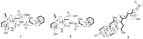 Key COSY (bold lines) and HMBC (arrows) correlations for compounds 1–3.