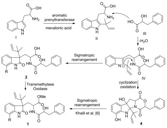The biosynthesis of diketomorpholine derivatives 1 and 2 were proposed as shown in Figure 6. Tryptophan (I) is considered as the starting material that is prenylated to form an intermediate (II), followed by addition with β-hydroxyphenylalanic acid (III) to form the known metabolite, 4,9-dideoxy-seco-PF1233 B carboxylic acid (IV) [7]. Compound 4 can be synthesized by immediately cyclization of IV, while compound 2 could be produced by a sigmatropic rearrangement of IV, following by a transmethylase oxidation to form compound 1. Compound 1 might also be obtained as a methanolysis product of compound 4 [6].