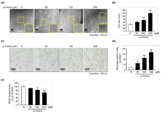 Effect of p-cresol on cellular senescence in MSCs. (a) Morphological changes in MSCs after treatment with p-cresol (50, 100, and 500 μM) for 72 h. Representative images are shown from one out of three independent experiments. Scale bar = 200 μm. (b) Determination of cell size (n = 10 images/cultured dishes). Values represent mean ± SEM. ** p < 0.01 vs. control. (c) After treatment with p-cresol (50, 100, and 500 μM) for 72 h, senescence was assessed by senescence-associated β-galactosidase (SA-β-gal) staining. SA-β-gal positive cells appear blue. Representative images are shown from one out of three independent experiments. Scale bar = 200 μm. (d) Cellular senescence was quantified as the number of SA-β-gal positive cells (n = 10 images/cultured dishes). Values represent mean ± SEM. * p < 0.05 and ** p < 0.01 vs. control. (e) After treatment with p-cresol (50, 100 and 500 μM) for 72 h, proliferation was assessed using a BrdU incorporation assay (n = 3). Values represent mean ± SEM. * p < 0.05 and ** p < 0.01 vs. control.