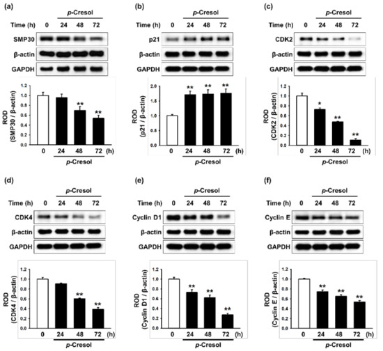 To determine the effects of p-cresol on cellular senescence in MSCs, we assessed morphology, senescence, and proliferative capacity after treatment with p-cresol (50, 100, 500 μM) for 72 h. Treatment with p-cresol significantly increased cell size (Figure 1a,b). A senescence-associated β-galactosidase (SA-β-gal) assay showed that p-cresol treatment significantly increased senescence in MSCs (Figure 1c,d). In addition, a BrdU incorporation assay showed that treatment with p-cresol significantly decreased the proliferative capacity of the cells (Figure 1e), with 500 μM of p-cresol resulting in cell senescence. To further investigate the effect of p-cresol on senescence- and proliferation-associated signaling pathways in MSCs, the expression of senescence-associated proteins (SMP30 and p21) and cell cycle-associated proteins (cyclin-dependent kinase 2 (CDK2), CDK4, cyclin D1, and cyclin E) was assessed by western blotting. After treatment with p-cresol (500 μM) for 0, 24, 48, or 72 h, the expression of SMP30, an anti-senescence marker, was significantly decreased in a time-dependent manner (Figure 2a) and the expression of p21, a pro-senescence marker, was significantly increased (Figure 2b). The expression of CDK2, CDK4, cyclin D1, and cyclin E was also decreased in a time-dependent manner (Figure 2c–f). These results indicate that p-cresol induces MSC senescence and inhibits the proliferative potential of the cells.