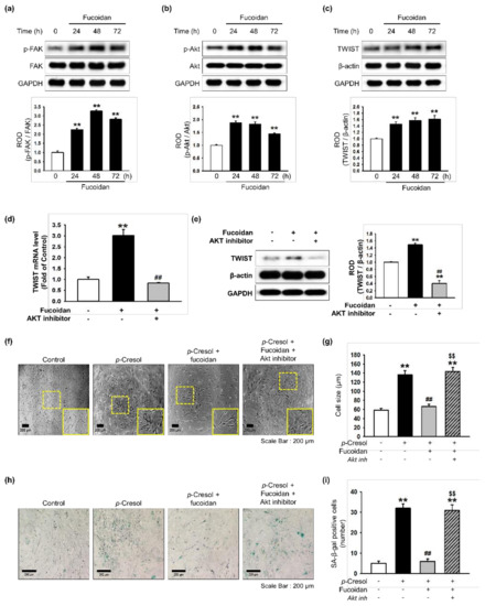 Our previous study showed that TWIST is a key pathway involved in restoring cellular senescence in endothelial progenitor cells [14]. In addition, αMβ2 integrin is a major receptor for fucoidan and its activation leads to FAK, and the FAK-Akt signal transduction pathway is associated with protection against cellular senescence in endothelial colony-forming cells [11]. We determined that a concentration of 10 μg/mL of fucoidan most significantly inhibited cell senescence (Supplemental Figure S1). In addition, to explore whether fucoidan regulates the FAK-Akt-TWIST signal transduction pathway in time-dependent manner in MSCs, we evaluated activation of the FAK-Akt-TWIST signal pathway after treatment with fucoidan (10 μg/mL) for 0, 24, 48, or 72 h. As expected, phosphorylation of FAK and Akt was significantly increased after fucoidan treatment in a time-dependent manner, with the maximal effect seen at 48 h (Figure 3a,b). The expression of TWIST was also significantly increased in a time-dependent manner (Figure 3c). In addition, Akt inhibition blocked the mRNA and protein expression of TWIST, indicating that fucoidan-mediated TWIST expression is dependent on FAK-Akt phosphorylation (Figure 3d,e). Furthermore, our results show that the inhibition of Akt signaling increased the number of SA-β-gal positive cells and changed the cellular morphology of MSCs, suggesting that fucoidan-mediated Akt signaling is involved in the protection of p-cresol-induced MSC senescence (Figure 3f–i). To further investigate the protective effect of fucoidan on cellular senescence in MSCs via the FAK-Akt-TWIST axis, we assessed cellular senescence and proliferative potential in MSCs pretreated with fucoidan after exposure to p-cresol. Fucoidan treatment prevented the increase in cell size following p-cresol exposure (Figure 4a,b). In addition, a SA-β-gal assay showed that treatment with fucoidan significantly decreased MSC senescence caused by p-cresol exposure (Figure 4c,d). Furthermore, cell cycle analysis revealed that fucoidan inhibited the decrease in proliferation caused by p-cresol (Figure 4e,f). The protective effects against senescence were blocked by TWIST knockdown (Figure 4a–f). Taken together, these findings suggest that fucoidan protects MSCs against p-cresol-mediated cellular senescence via FAK-Akt-TWIST signal transduction.