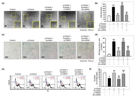 Regulation of senescence- and cell cycle-associated proteins in senescent MSCs is dependent on fucoidan-mediated TWIST expression. (a–f) After p-cresol (500 μM, 72 h) exposure, expression of SMP30 (a), p21 (b), CDK2 (c), CDK4 (d), cyclin D1 (e), and cyclin E (f) in MSCs, fucoidan-treated MSCs, and fucoidan-treated MSCs pretreated with si-TWIST was assessed by western blotting. Protein levels were quantified by densitometry relative to β-actin levels (n = 3). Values represent mean ± SEM. * p < 0.05 and ** p < 0.01 vs. control (non-treatment), # p < 0.05 and ## p < 0.01 vs. treatment with p-cresol alone, $ p < 0.05 and $$ p < 0.01 vs. treatment with p-cresol and fucoidan, & p < 0.05 and && p < 0.01 vs. treatment with p-cresol, fucoidan, and si-TWIST.
