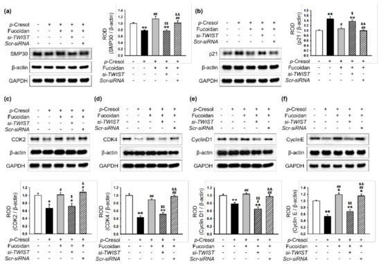 To investigate whether fucoidan-mediated TWIST expression regulates the activation of senescence-and proliferation-associated proteins after treatment with p-cresol, the expression of these proteins was assessed by western blotting. After p-cresol exposure, fucoidan inhibited the decrease in SMP30 expression and the increase in p21 expression (Figure 5a,b). Fucoidan also increased the expression of CDK2, CDK4, cyclin D1, and cyclin E (Figure 5c–f). Transfection with TWIST siRNA suppressed the protective effect of fucoidan on the regulation of senescence- and cell cycle-associated proteins (Figure 5a–f). These data indicate that fucoidan is involved in the regulation of senescence- and cell cycle-associated proteins in p-cresol-induced senescent MSCs, via the FAK-Akt-TWIST pathway.