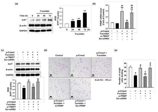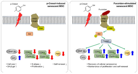 Here, we investigated the protective potential of fucoidan on p-cresol-induced cellular senescence in MSCs via regulation of the focal adhesion kinase (FAK)-Akt-class A basic helix-loop-helix protein 38 (TWIST) axis. We found that modulation of the proliferation signaling pathway in p-cresol-induced senescent MSCs was regulated by fucoidan-mediated cellular prion protein (PrPC).