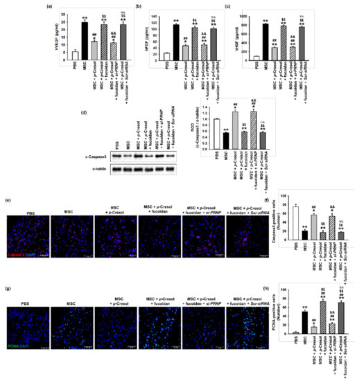 To determine whether fucoidan enhances the function and survival of MSCs exposed to uremic toxins, ischemic tissues were harvested at postoperative day 3 and a growth factor ELISA assay was performed (Figure 7a–c). The expression levels of angiogenic cytokines, including hVEGF, hFGF, and hHGF, were significantly increased following the injection of fucoidan-stimulated MSCs exposed to p-cresol, compared with those in the other groups. To investigate the survival of transplanted MSCs in ischemic damaged sites, the level of cleaved caspase-3 was analyzed in ischemic tissues at 3 days following MSC transplantation (Figure 7d). The expression of cleaved caspase-3 was significantly decreased following the injection of fucoidan-stimulated MSCs exposed to p-cresol (Figure 7d). In addition, we evaluated the viability and proliferation of transplanted MSCs into the ischemic site by immunofluorescence staining. The transplantation of fucoidan pretreated MSCs exposed to p-cresol significantly inhibited cleaved caspase-3 expression compared with non-pretreatment MSCs or PrPC-downregulated MSCs (Figure 7e,f). Furthermore, Proliferating cell nuclear antigen (PCNA) fluorescence staining demonstrated that cell proliferation in ischemic damaged tissues was significantly increased following the injection of fucoidan-treated MSCs exposed to p-cresol, compared with that in other groups (Figure 7g,h). These findings suggest that fucoidan protects MSCs from p-cresol-induced deficiencies in the secretion of angiogenic cytokines, cell survival, and proliferation following transplantation into ischemia sites via the regulation of PrPC expression.