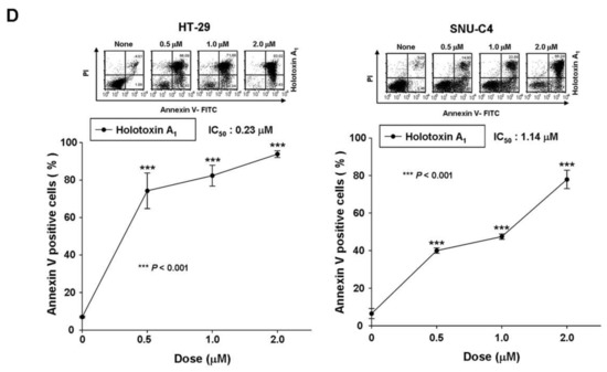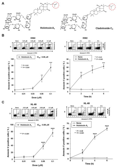 Holotoxin A1 induces apoptosis in human leukemic and colorectal cancer cells. (A) Structures of holotoxin A1 and cladoloside C2; (B,C) Cells were seeded, cultured for 4 h, and then treated with holotoxin A1, (left panels) for 6 h at various concentrations (0, 0.01, 0.03, 0.05, or 0.1 μM) and (right panels) for the indicated times (0.06 µM holotoxin A1); The percentage of apoptotic cells was determined in (B) K562 cells and (C) HL-60 cells with annexin V-FITC/PI staining; (D) Cells were seeded, cultured for 24 h, and then treated for 24 h with various concentrations of holotoxin A1 (0, 0.5, 1.0, or 2.0 μM). The percentage of apoptotic cells was measured in (left panel) SNU-C4 cells and (right panel) HT-29 cells with annexin V-FITC/PI staining; (B–D) Upper panels: Representative flow cytometry results indicate the extent of apoptosis. Lower panels: Mean ± SD of three independent experiments. * p < 0.05; ** p < 0.01; *** p < 0.001 vs. control cells.