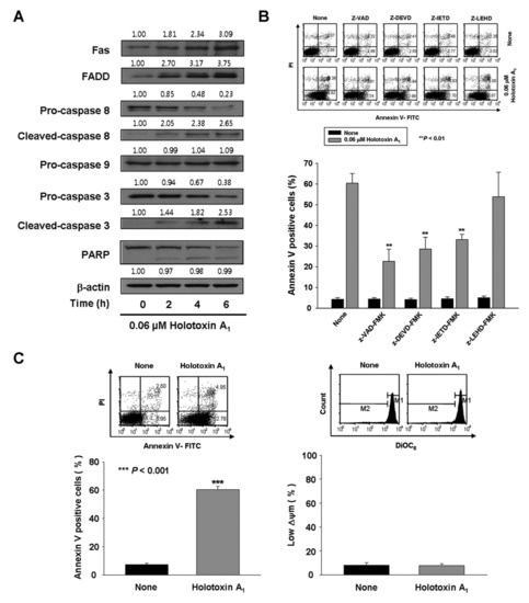 Holotoxin A1 was isolated and purified with the procedure described by Silchenko et al. [18], then dissolved in sterilized distilled water. Annexin V was obtained from BD Biosciences Clontech (Palo Alto, CA, USA). Anti-Fas, anti-FADD, anti-procaspase-8, anti-cleaved caspase-8, anti-procaspase-3, anti-cleaved caspase-3, anti-procaspase-9, anti-cytochrome c, anti-Bcl-2, anti-Bcl-xL, anti-Mcl-1, anti-acid SMase, anti-neutral SMase, and anti-β-actin antibodies were purchased from Santa Cruz Biotechnology (Santa Cruz, CA, USA). Anti-poly (ADP-ribose) polymerase (PARP) antibody was purchased from Cell Signaling Technology (Beverly, MA, USA). Unless otherwise stated, all other chemicals were obtained from Sigma (St. Louis, MO, USA).
