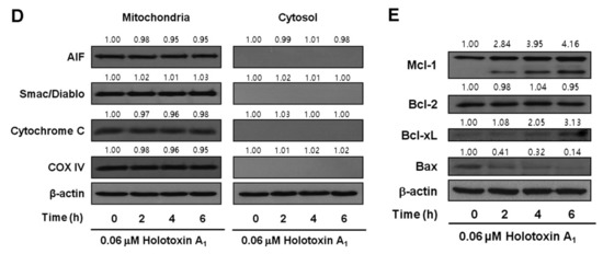 Cells were treated with sterilized water or with holotoxin A1 for the indicated times, then the mitochondrial and cytosolic fractions were separated as previously described [28,29]. Briefly, cells were harvested and resuspended in mitochondrial isolation buffer (20 mM Hepes-KOH, pH 7.5, 210 mM sucrose, 70 mM mannitol, 1 mM EDTA, 1 mM DTT, 1.5 mM MgCl2, 10 mM KCl) and protease inhibitor cocktail (Boehringer Mannheim, Mannheim, Germany) supplemented with 10 μM digitonin. Suspensions were incubated at 37 °C for 5 min and centrifuged at 12,000× g for 15 min. The supernatant (cytosolic fraction) was collected for Western blotting.
