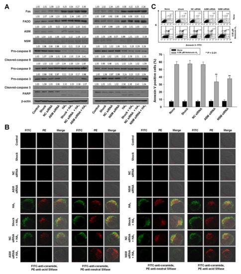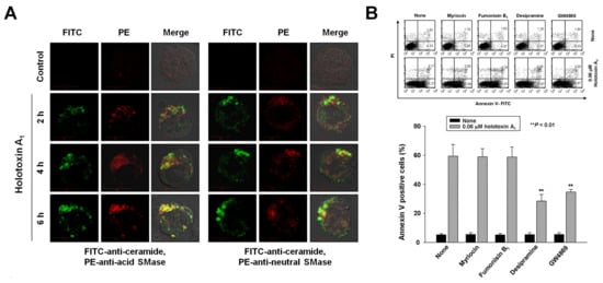 We purchased pre-designed siRNAs that targeted either the human acid SMase mRNA (catalog number SI00011557; ID 6609) or the neutral SMase mRNA (catalog number SI02655114; ID 6610) and the AllStars negative control siRNA (catalog number 1027280) from Qiagen (Hilden, Germany). SiRNA transfections were performed as described previously [15]. Briefly, for transfection, cells (1.3 × 107 cells/0.5 mL) were resuspended in PBS and mixed with 200 nM anti-acid SMase siRNA, anti-neutral SMase siRNA, or non-silencing siRNA. This mixture was added to an electroporation cuvette with a 0.4 cm electrode gap and subjected to 300 V and 950 μF in a Gene Pulser Xcell Electroporation System (Bio-Rad, Richmond, CA, USA). After electroporation, the cells were cultured for 48 h in RPMI1640 supplemented with 10% FBS, then treated with sterilized water or holotoxin A1 for the indicated times. Finally, the cells were analyzed with annexin-V staining (Section 4.3), immunofluorescence (Section 4.8), and Western blot (Section 4.7) methods.