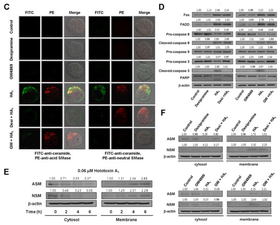 Previously, we reported that cladoloside C2 induced apoptosis by activating ceramide synthase 6 (CerS6) to generate ceramide [17]. Accordingly, due to their similar structures, we expected that holotoxin A1 would induce apoptosis through the same mechanism. To test this hypothesis, we performed immunofluorescence staining and found that holotoxin A1 treatment increased ceramide production in K562 cells in a time-dependent manner (Figure 3A). Next, we investigated which of three enzymes was activated by holotoxin A1 to induce apoptosis: acid SMase, neutral SMase, or ceramide synthase. We pretreated the cells for 1 h with desipramine (acid SMase inhibitor), GW4869 (neutral SMase inhibitor), myriocin (serine palmitoyl transferase inhibitor), or fumonisin B1 (ceramide synthase inhibitor), followed by holotoxin A1 treatment. We found that holotoxin A1-induced apoptosis was partially blocked by pretreatment with desipramine or GW4869, but not by pretreatment with myriocin or fumonisin B1 (Figure 3B). The holotoxin A1-mediated activation of caspase-3 was blocked by pretreatment with desipramine or GW4869; however, its activation of Fas and caspase-8 was not inhibited by pretreatment with desipramine or GW4869 (Figure 3C). Holotoxin A1-mediated ceramide production was also inhibited by pretreatment with desipramine or GW4869 (Figure 3D). We next investigated whether holotoxin A1 treatment caused a change in the subcellular location of acid SMase or neutral SMase with immunofluorescence microscopy. We observed that the holotoxin A1-mediated activation of acid SMase or neutral SMase resulted in translocation of the enzymes to the plasma membrane (Figure 3A,D). These translocations into the membrane from the cytosol were confirmed with Western blot analysis (Figure 3E). Moreover, the translocation of acid SMase or neutral SMase from the cytosol to the membrane was inhibited by desipramine or GW4869, respectively (Figure 3F). Taken together, these results suggested that the ceramide generated by holotoxin A1 activation of acid SMase and neutral SMase, might partly contribute to apoptosis induced by holotoxin A1 in leukemic cells.